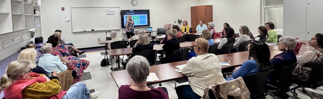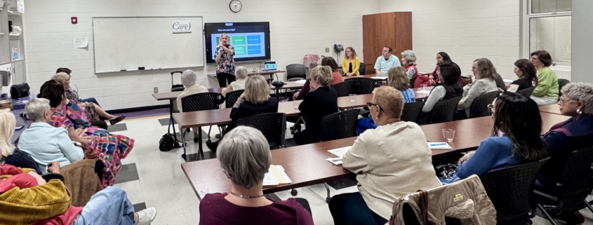 Everyone enjoyed a delicious buffet of pasta salad, stuffed croissants with pimiento cheese and chicken salad, fresh fruit, brownies, and fruit punch elegantly served by Karen Smith, Bobbie Fulton, and Kelli Eberhardt of the Social Committee. Kelly Buckshorn of the Communications Committee circled through the group snapping photos to memorialize another of our gatherings. After a fun 45-minute social in the sunshine-filled lobby of the gymnasium, all proceeded to a comfortable classroom and settled in for an engaging program.