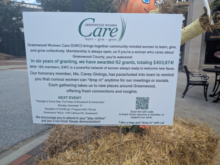 Mary then noted: “It has been deeply meaningful to me to guide the creation and establishment of Greenwood Women Care since the earliest days of research into, and focus group discussions about, women’s giving collectives in 2016; through the formation of our Steering Committee in 2017 and our Charter Membership year of 2018; until this point in our 8th membership year and 7th year of grantmaking. Thank you for this distinct privilege, and special thanks to the many of you who have supported this enterprise with your positive dedication, hard work, creative ideas, and generous spirit. We grow as empowered women – empowered to serve, to lead, to generate, to support, and to strengthen the fabric of Greenwood County.” She commended Rachel Strayer, incoming GWC Chair, saying, “She brings uncommon energy, care, and commitment to all she sets her mind to. And she is an absolute delight to know and to work alongside! Thank you, Rachel, for assuming this role on behalf of all of us!”